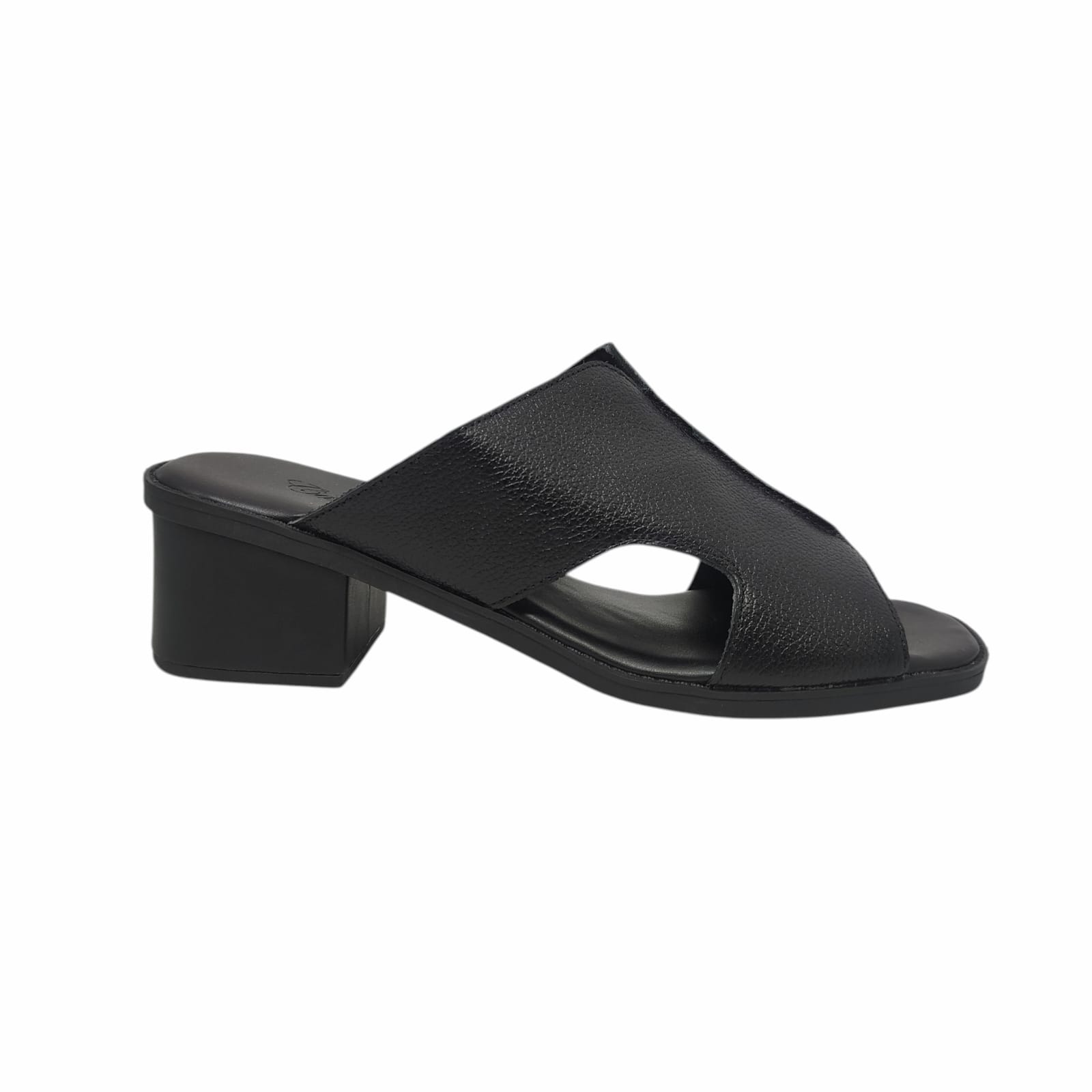 Tamanco em couro com combinações de couro e salto quadrado.
